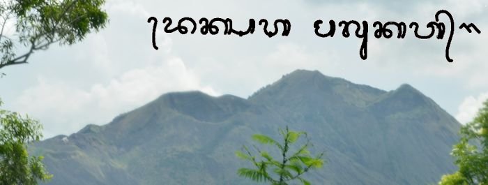 alte balinesische Handschrift mit Schriftzug Deeksha-Melukat, im Hintergrund der Vulkan Gunung Agung auf Bali